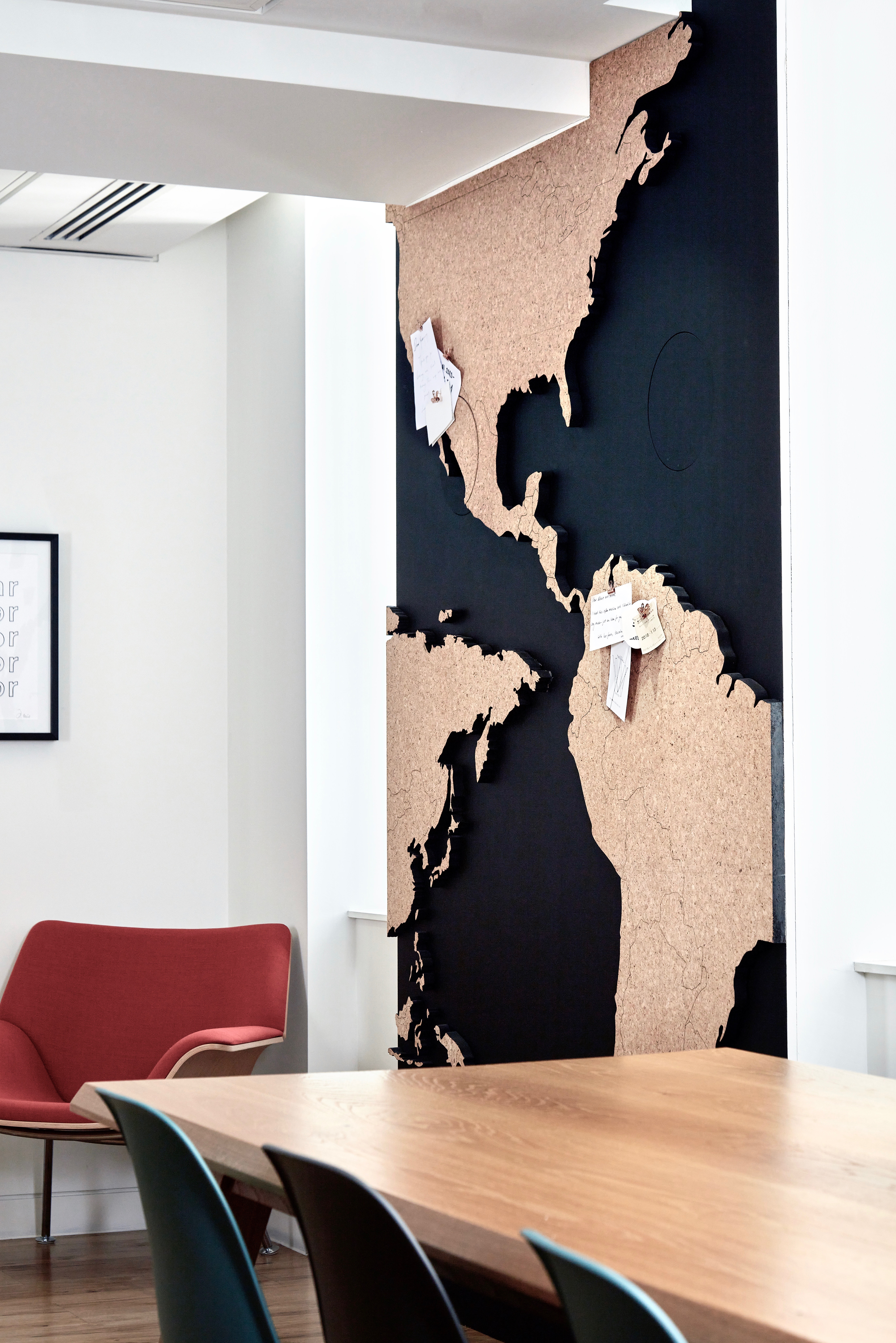 As well as being a piece of design to brighten up the space it was created for, I chose to make it out of cork so it can double as a cork board where the Macrosynergy team members could pin up key memories from places they have visited as a company, then at the end of the year photograph the process and advancement of the team, before starting with a clear board for the new year. The cork used was an thick, recycled cork which was later cut all the way through to give that black burnt effect on the edges and then using the same laser cutter, embossing very thin lines to serperate the countries. The interactive nature of the piece was very important for the hedge-fund as it was installed in the office common area, they wanted something that everyone could contribute to throughout the year in order to bring the team closer together in a common project.